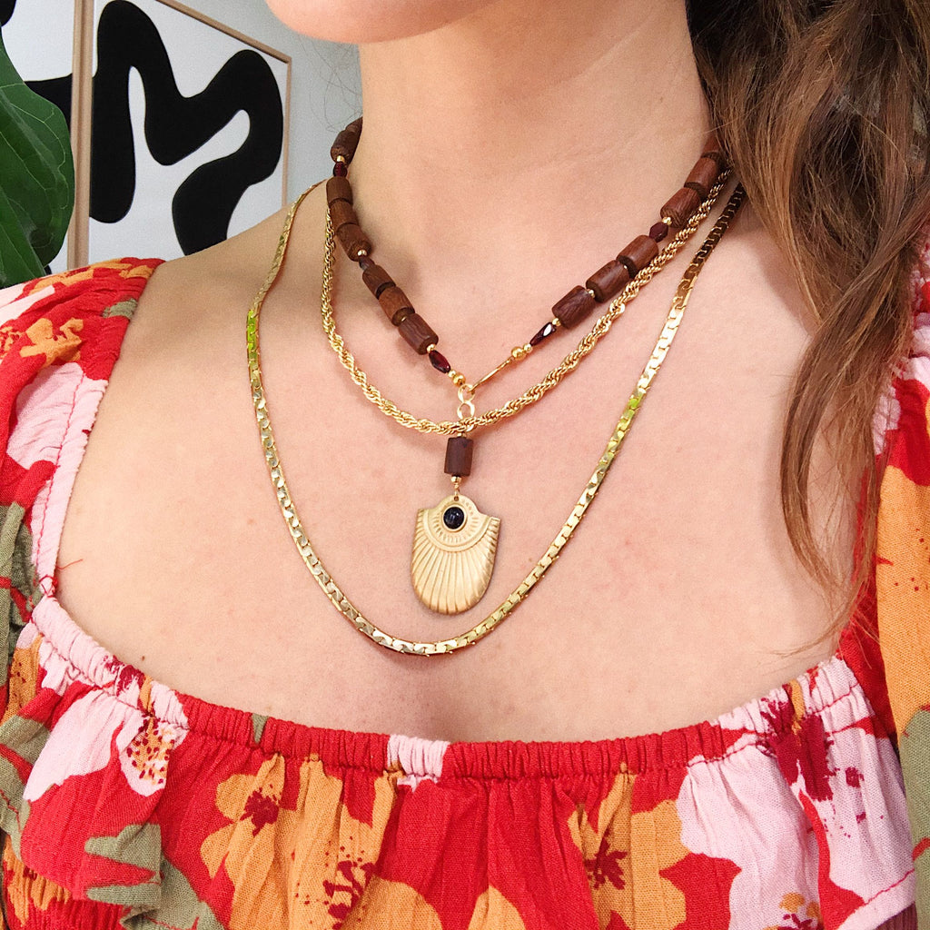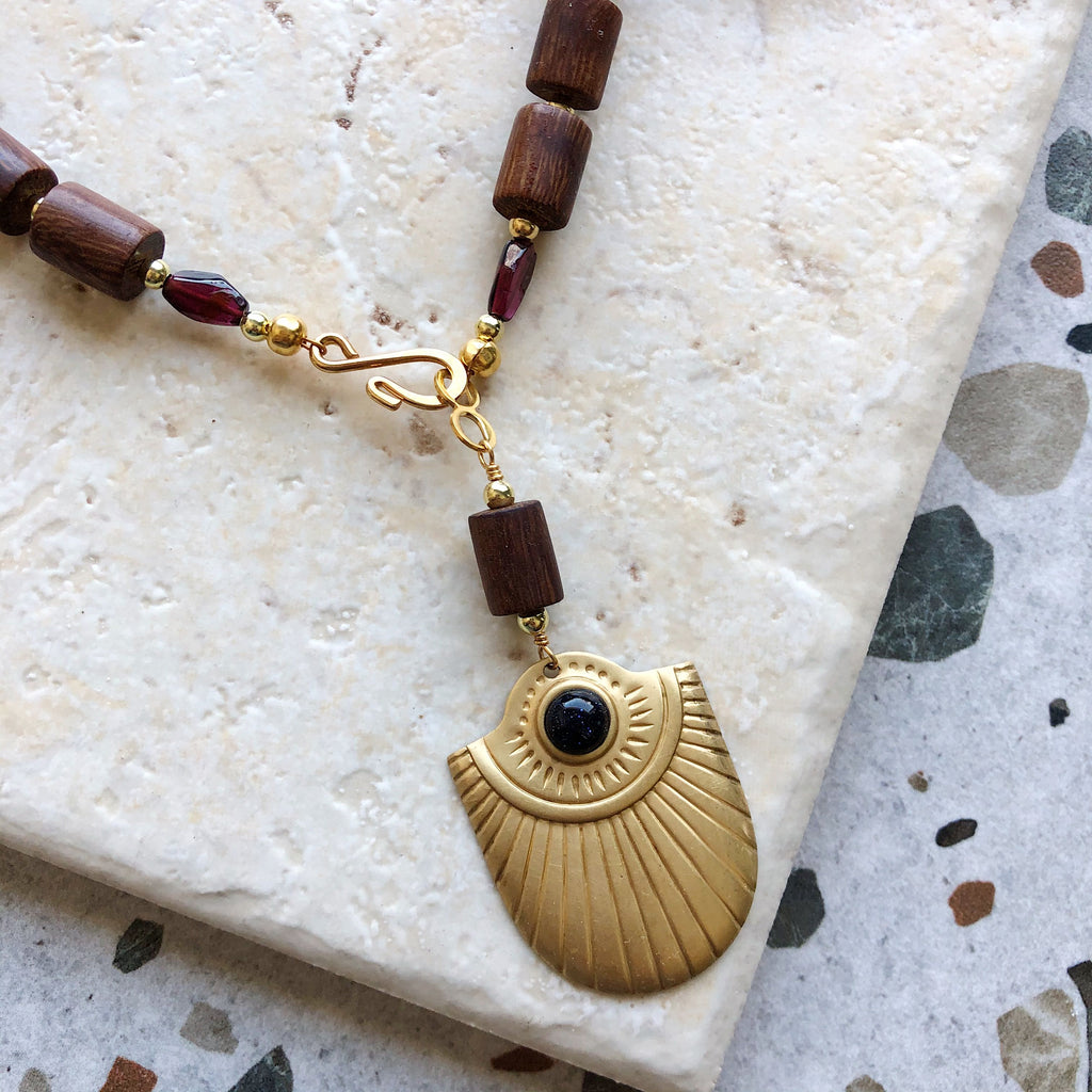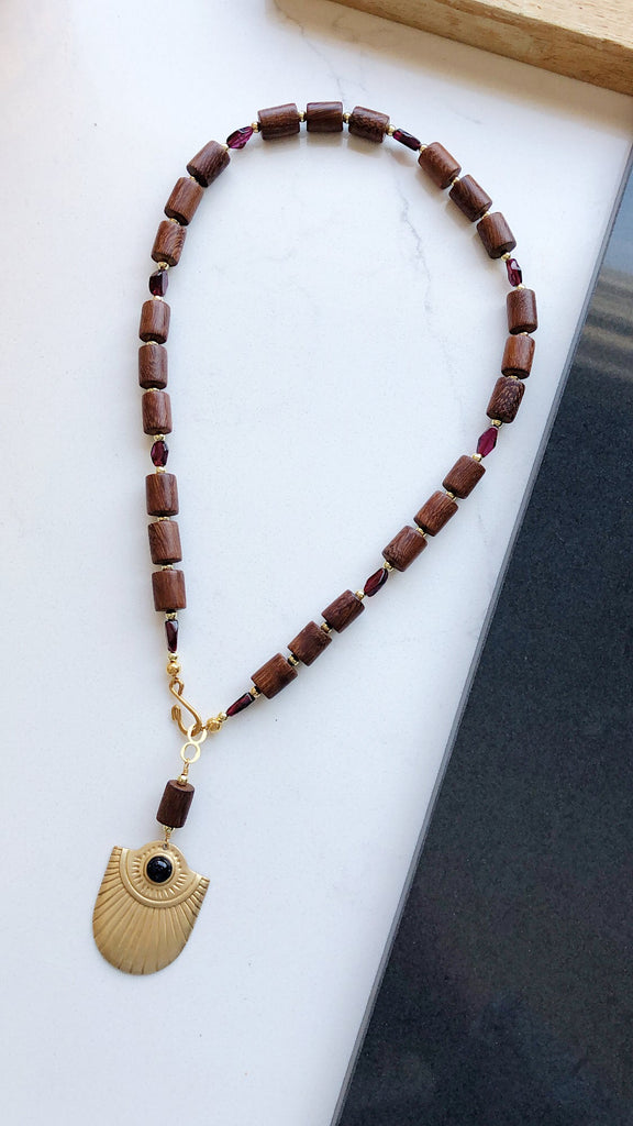 Luxurious wooden beads and diamond cut garnet stones. A vintage pendant hangs from a delicate hook clasp.